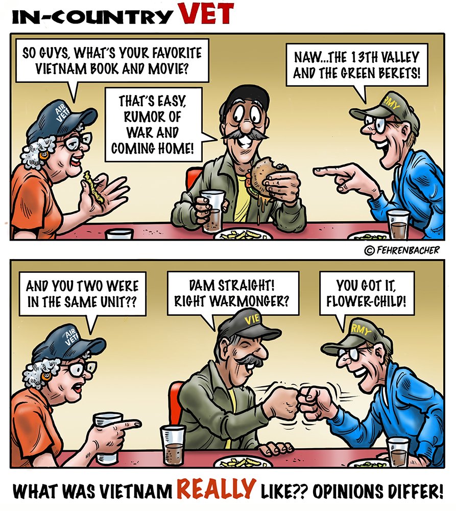 Phil enlisted in the Army in 1965 where he served for years in Vietnam. He became a graphic designer and has worked for the state of Oregon for 26 years. He retired in 2003 and started the Cartoon "In-Country". The cartoons reflect his experiences during his tour of duty in South Vietnam.